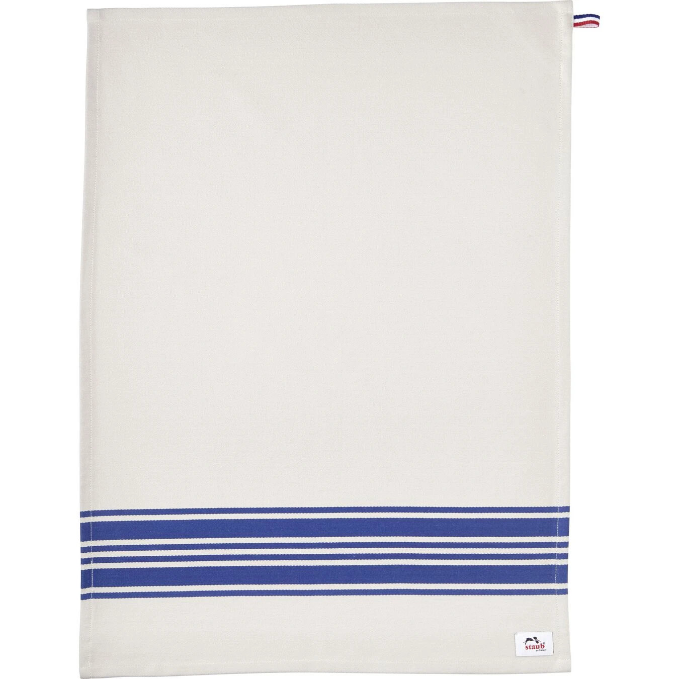 Das neue STAUB Küchenhandtuch erfüllt, wie jedes andere STAUB Produkt, die höchsten Ansprüche an ein Kochutensil. Es ist für eine lange Lebensdauer auf allen vier Seiten gesäumt und besonders hochwertig verarbeitet. Im bewährten Maß 50 cm x 70 cm und mit einem stabilen Aufhänger versehen, entspricht das stark saugfähige Geschirrtuch den funktionellen Anforderungen selbst professioneller Küchenchefs. Dabei kennt das Einsatzspektrum eines Küchenhandtuchs kaum Grenzen. Vom Abtrocknen und Polieren von Geschirr und Besteck bis zum Abwischen der Arbeitsplatten, als Helfer in der Not – den festen Platz über der Schulter oder am Gürtel sich das beliebte Stück Stoff redlich verdient. Natürlich übernimmt ein Textil in einer hochwertigen Küche auch eine dekorative Funktion: Das Design ist absolut zeitlos und lebt von dem schönen Kontrast des 6-gliedrigen Streifens in Blau auf dem naturweißen Hintergrund. Die Farben der französischen Tricolore dürfen nicht fehlen und finden sich in einer kleinen Schlaufe am umgenähten Saum wieder. Ein dezentes STAUB Etikett weist das Tuch als Markenprodukt aus.