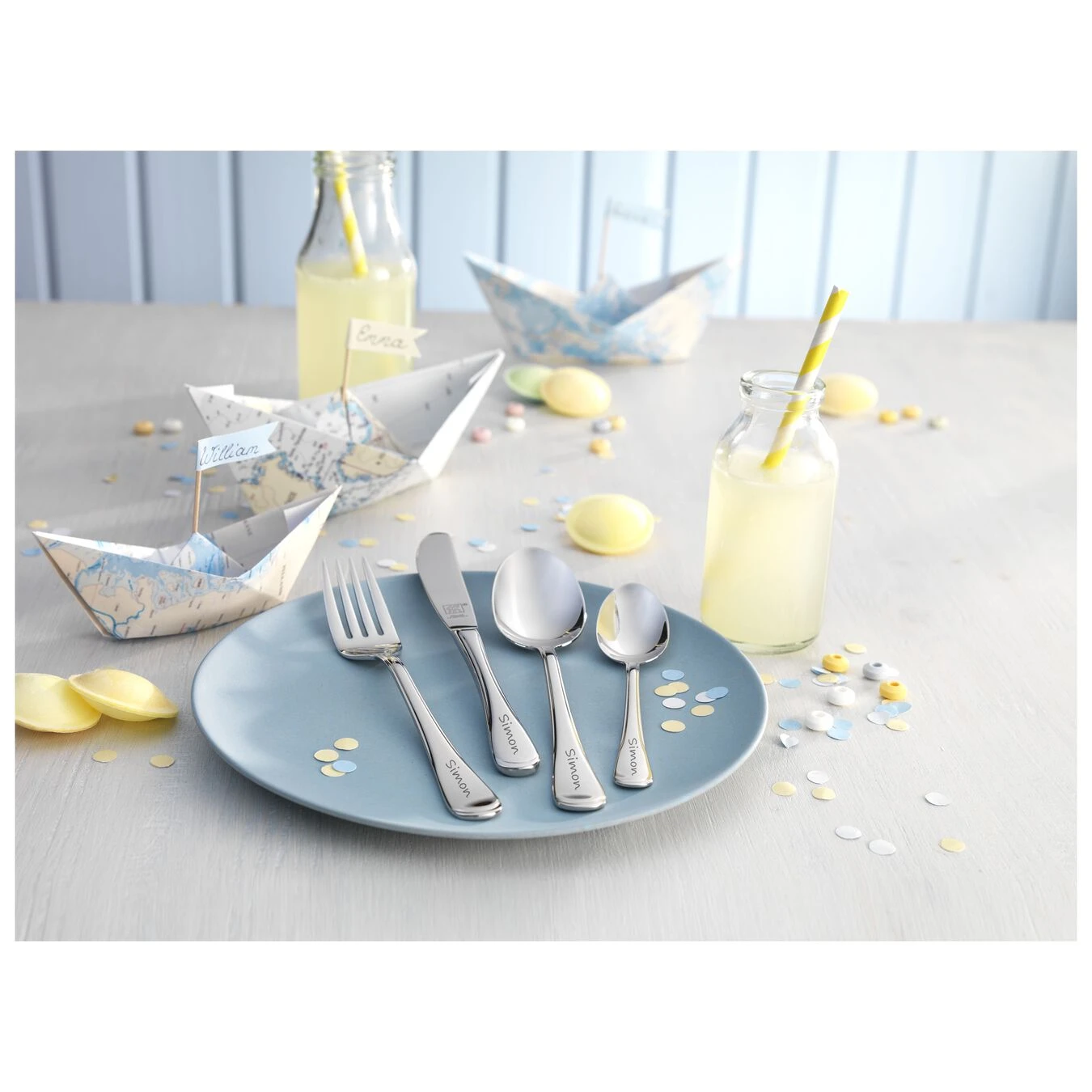 Kinderhände brauchen das passende Besteck. Ideal für die Kleinen ab drei Jahren ist deshalb das 4-teilige Kinderbesteck-Set Filou mit den speziell geformten Griffen. Für mehr Sicherheit sorgen zudem die abgerundeten Löffelkanten und Gabelspitzen sowie die abgestumpfte Messerschneide. Die einzelnen Teile bestehen aus hochwertigem, poliertem Edelstahl in bewährter ZWILLING Qualität. Dadurch ist das Besteck nicht nur formstabil, rostfrei und geschmacksneutral, sondern auch geeignet für die Reinigung in der Spülmaschine. Für ein ganz persönliches Geschenk zu Geburt oder Taufe besteht die Möglichkeit, das Besteck über eine Gravur unverwechselbar mit dem Namen des Kindes oder einem besonderen Datum zu gestalten.